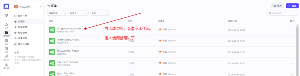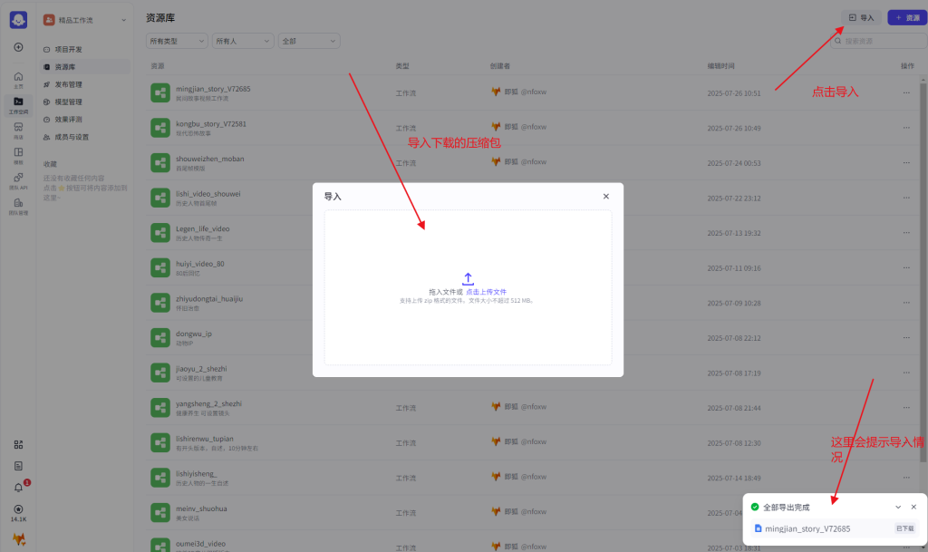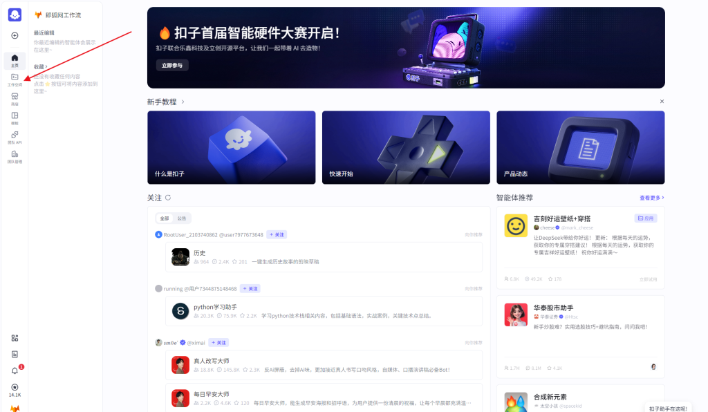 如何导入coze工作流 2025-12-31 精品课程 112 如何导入coze工作流 第一步:登录扣子官网www.coze.cn,然后注册账号后,进入扣子开发平台 第二步:点击工作流空间 第三步:进入空间后,右上角点击导入,会弹出导入框,将在即狐网下载的工作流压缩包上传,等待5秒左右即可完成上传,右下角有上传提示。 第四步:导入成功后,工作空间会显示该工作流,进入使用即可 本站所有内容均来源于互联网相关合法站点的资源,如有异议可联系我们! 0 0 AI教程cozeDeepSeek